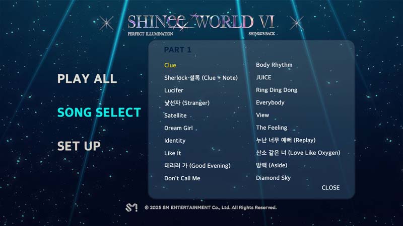 Tracklist Disc 1: 01. Clue 02. Sherlock·?? (Clue + Note) 03. Lucifer 04. ??? (Stranger) 05. Satellite 06. Dream Girl 07. Identity 08. Like It 09. ??? ? (Good Evening) 10. Don't Call Me 11. Body Rhythm 12. JUICE 13. Ring Ding Dong 14. Everybody 15. View 16. The Feeling 17. ?? ?? ?? (Replay) 18. ?? ?? ? (Love Like Oxygen) 19. ?? (Aside) 20. Diamond Sky